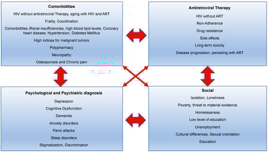 The specificity of presenting the individual components of the different categories comes from the clustering of the individual aspects and the exacerbation of the overall situation. The challenge in the care of PLWH often lies in the management of social factors []. HIV management includes medication and care optimization, symptom management, self-care education, comorbidity management, and continuity care, as well as emotional and social support. For the treatment of common depression, collaboration between different disciplines also delivers an improvement in PLWH in the primary care setting as a disease management program [].