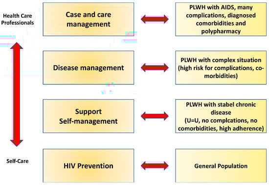 The provision of a comprehensive multidisciplinary care system has been the most effective option for PLWH for effective and continuous treatment. Unlike countries with a high HIV prevalence, a large population density, poverty, a lack of hygiene standards, no full access to health care or access to ART, high-income countries additionally face stigma and discrimination []. Due to the continuum of complications, additional symptoms with burdens, polypharmacy, and the resulting side effects and interactions, HIV/AIDS can occur in a very complex condition image []. Resilience in particular is also necessary for PLWH to cope, and a complex disease course can result because PLWH with low resilience become particularly vulnerable []. This vulnerability is seen as post-traumatic stress, depression and anxiety, and a lack of adherence. The concept of integrated care can identify and treat mental health symptoms, such as anxiety and adherence issues, as well as other effects, in a timely manner through timely assessments []. The Kaiser Permanente (KP) model for chronically ill patients from the United States is suitable for adapting integrated care to PLWH. The KP model of IC is based on the stratification of PLWH for the targeted, needs-based delivery of various services. In addition to the treatment of the HIV infection, the services include prevention and monitoring and the minimizing of risk factors for potential complications and resulting comorbidities. PLWH receive additional support in self-managing their disease, with the goal of achieving the highest possible level of health literacy []. PLWH as high-risk patients receive disease and case management combined with targeted professional care from health care professionals. The core components of the KP model are prevention, self-management support, disease management, and case and care management (Figure 5). The first component of integrated care is based on HIV prevention for the entire population. PLWH are included, provided that patients have a high adherence with the outcome: Undetectable is Untransmittable (U=U) [,]. The next stage is characterized by support for the development of self-management strategies for PLWH as chronically ill patients with stable situations. If needed, health care professionals in integrated care are available to PLWH. If the patients have a high level of health literacy, PLWH make targeted and independent decisions to use the appropriate service. The penultimate stage corresponds to disease management for patients with an already complex disease situation, as well as a high risk of additional complications that have a massive negative impact on the existing HIV infection. The top level is associated with case and care management and the involvement of the entire network of IC [,].