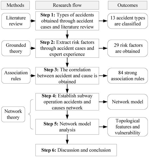 Based on this literature review, the leading research status and trends of subway safety management are displayed, and the framework of this research is shown in Figure 2. The overall framework of this research is mainly divided into five steps. The first step is to classify subway accidents during operation into 13 types. The second step is to obtain the causative factors through reviewing the accident cases and expert experience. The third step is to apply the association rule Apriori algorithm for mining potential associations between causative factors and accidents. The fourth step is to employ complex network theory to build the subway operation accident causation network (SOACN). The fifth step is to analyze the topological features and vulnerability of SOACN. Finally, this paper summarises the research results and suggests promoting subway operation safety.