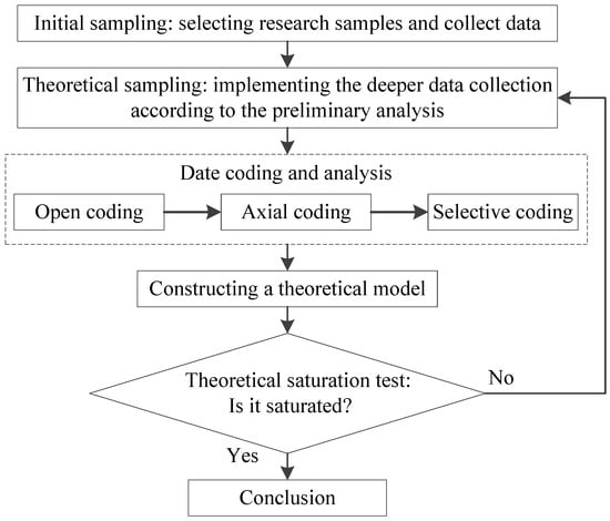 The primary process of implementing grounded theory is shown in Figure 3. The research data should be collected first. Secondly, open coding, axial coding, selective coding and theoretical saturation tests are carried out to analyze sequences. In this step, coding refers to the continuous comparison between concepts and events to facilitate the conceptualization of data. Theoretical saturation refers to saturated data and information extracted from the sample. Once the saturation test is completed and verified, the theory will not be affected by the new sample.