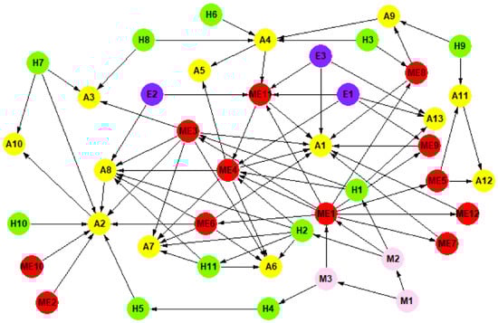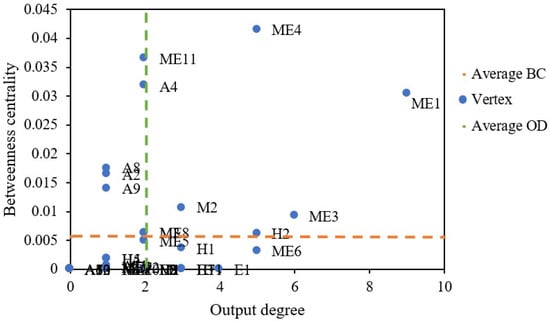 Betweenness centrality (BC), output degree (OD) and their average values (green and orange dotted lines) are illustrated in Figure 11. Improper operation and maintenance of equipment and facilities (ME1) and signal failure (ME4) have high values of BC and OD. This indicates that these two causative factors could quickly induce the occurrence of other risks. The onsite safety management personnel should give sufficient focus to these specific safety risks. Applying these results may enhance the management level of risk sources, significantly decreasing the probability of subway operation accidents.