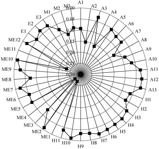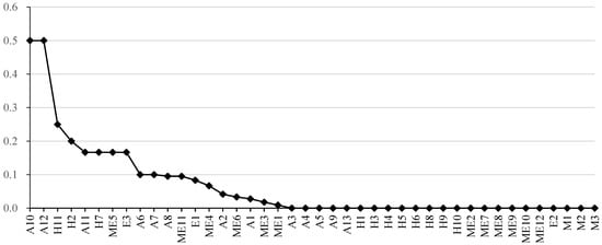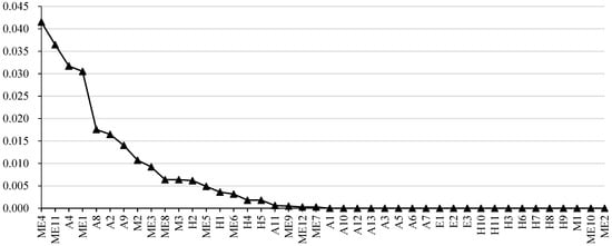 The original network efficiency of the SOACN is 0.0915. Figure 9 shows the change rate of network efficiency after each vertex is deleted. The more efficiency decreases, the higher the vulnerability increases. It can be seen from the calculation results that among the vertexes of accident types, fire accident (A2) and passenger falling off the rail (A4) are most vulnerable. Safety management should pay attention to preventing these two types of accidents. Among the causation vertexes, improper operation and maintenance of equipment and facilities (ME1), signal failure (ME4) and power failure/power supply interruption/power supply device failure (ME11) are the top three causation vertexes. Compared with other vertexes, they have a considerably more significant influence. All three are machine and equipment factors. Therefore, subway operation safety management personnel should focus on the operation and maintenance of machines and equipment in their daily management to prevent the spread of safety risks from the source.