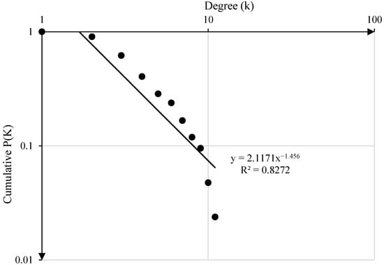 In a scale-free network, the degree value has the characteristics of a power-law function. Figure 8 shows the cumulative degree distribution of all vertexes in the SOACN. The degree-distribution function fits the power-law function P(k) = 2.1171*k−1.456, indicating that the SOACN is a scale-free network. The importance of individual vertexes in a scale-free network is relatively higher than other vertexes in the network, which means that a small number of vertexes in the network can affect the structure and function of the network to a greater extent. Therefore, it is necessary to focus on the crucial vertexes in the network and strengthen safety management.