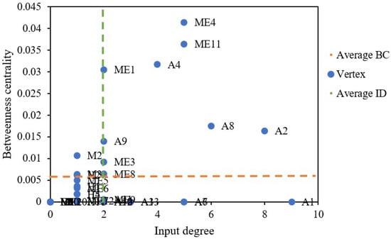 Topological characteristics can provide a good reference for safety management. Controlling risk transmission is an essential approach to reducing safety accidents. It identifies the critical features and any associated risks. It helps improve the scientific and rational distribution of safety resources. Betweenness centrality (BC), input degree (ID) and their average values (green and orange dotted lines) are illustrated in Figure 10. signal failure (ME4), power failure/power supply interruption/power supply device failure (ME11), fire accidents (A2), passenger falling off the rail (A4), and train derailment accidents (A8) have high values of BC and ID. This indicates that these two causative factors and three accident types could easily be evoked and transmitted to other risks.