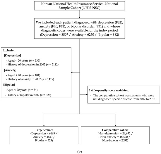 A brief description of the study design is presented in Figure 1a. This study was designed as a retrospective cohort using healthcare claim data. Thus, we set the washout period, index period, and follow-up period, respectively. Specifically, we conducted a washout period of one year (2002) to remove the possibility of diagnosis for BMS prior to depression, anxiety, and bipolar diagnosis. In this study, we included patients who were diagnosed with depression (F32), anxiety (F40, F41), or bipolar disorder (F31) and whose diagnostic codes were available for the index period. Moreover, we excluded patients (1) aged under 20 years, (2) who died during the index period, or (3) diagnosed with BMS (K14.6) before the diagnosis of depression, anxiety, or bipolar disorder. Additionally, we only selected the diagnostic code for BMS assigned by otorhinolaryngologists to enhance the diagnostic accuracy. Moreover, to eliminate the possibility of including patients who developed BMS before being diagnosed with depression, anxiety, or bipolar disorder, we set the washout period before the index period. Thus, we excluded patients identified in the year 2002 in this database. Then, we selected matched individuals for the comparison group from the remaining cohort registered in the database, namely four participants without cancer for each depression, anxiety, or bipolar patient (Figure 1b).