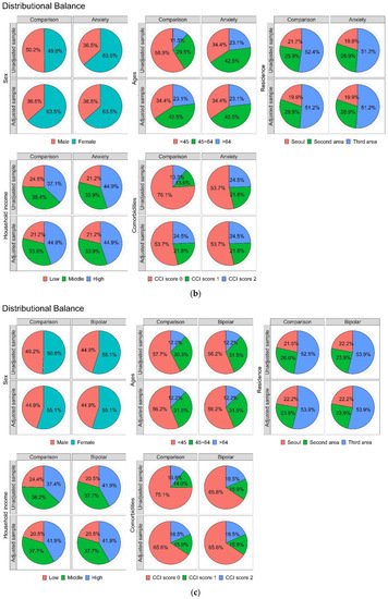 (a) Matching of the five main independent variables illustrated by balanced plots between comparison and depression groups. (b) Matching of the five main independent variables illustrated by balanced plots between comparison and anxiety groups. (c) Matching of the five main independent variables illustrated by balanced plots between comparison and bipolar groups.