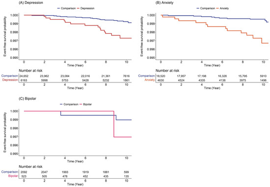 Burning mouth syndrome-free survival probability of burning mouth syndrome in patients with (A) depression, (B) anxiety, and (C) bipolar.