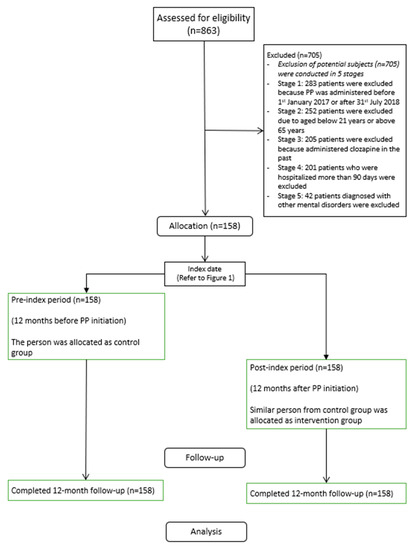 Patients who were prescribed oral antipsychotics for 12 months, followed by the initiation of treatment with PP1M between 1 January 2017 and 31 December 2018, and remained on PP1M for at least 3 months were selected from the hospital database. Inclusion criteria included patients between the age of 21 and 65 years; patients with the Diagnostic and Statistical Manual of Mental Disorders, Fourth Edition (DSM-IV) diagnoses of schizophrenia, schizophreniform disorder, brief psychotic disorder, schizoaffective disorder, delusional disorder, psychotic disorder not otherwise specified, psychotic disorder due to a general medical condition and substance-induced psychotic disorder; and who were on PP1M for at least 3 months. Patients who were prescribed Clozapine in the past and long-stay inpatients who were admitted for more than 3 months were excluded.