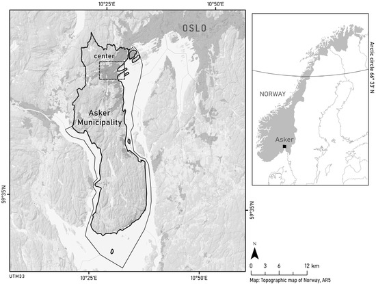 Asker municipality is located just outside Oslo in south-eastern Norway (Figure 1). Asker municipality covers 189 km2, and has a population of ca. 60,000 inhabitants. The population density is 259 people per square km (accessed on 1 January 2022, www.ssb.no), compared to a national average of 15. Major infrastructure, in terms of roads and railways, traverse the municipality.