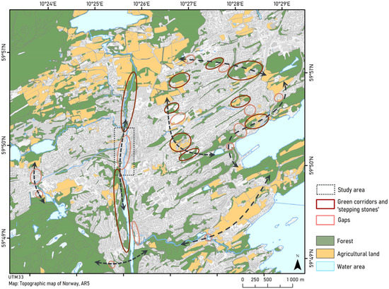 Our next step was to gather various types of data on abiotic and biotic aspects of Asker municipality. Thus, we collected thematic maps on geology and soil, landform, and vegetation cover, occurrences of red-listed species and nature types, and built-up land. These maps are available free of charge in Norway. While our inspection could be interpreted to illuminate multiple challenges, it also clearly illustrated how fragmentation due to infrastructure and urban development and agriculture could represent challenges to the movement for most land-living animal species. Several studies have documented how connectivity is important to various species, ranging from butterfly and plant specialists [39] to grizzly bears [40] and fish [41]. Although there are situations where connectivity may be harmful [42], in general, recommendations have emphasized the need to ensure connectivity between fragmented habitat patches to enable movement, and thus ensure genetically sound populations and species persistence in the long term [39,43,44]. Having familiarized ourselves with the municipality through studying these maps, we decided to emphasize design that could help mitigate fragmentation effects and chose connectivity as the landscape ecology principle to work with in our design. While it is possible to calculate fragmentation and various additional aspects of landscape content and composition using tools and indices, such as Fragstats™ and GIS software [45], this is rarely an approach used by landscape architects and land-use planners in Norway [46], thus we decided not to include this type of measures.