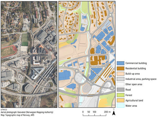 Asker center, the focus area of this study, is a densely populated urbanized area with a heterogeneous land cover, divided by the river Askerelva (Figure 3). The river and surrounding areas contribute to the municipality’s heterogeneity, as do the recreational areas, transport infrastructure, and the commercial center. In addition, there are also elements of parks and gardens that may contribute habitat and ecological functions in this small urban center. Several data sources with biological and land-use/land cover information are freely available in Norway. The most important ones in this context were data on land-use (Land-use/cover map (scale 1:5000)) [48] and Orthophotos [48]. We also used data from ‘Naturbase’, containing data on species observations, protected areas, valuable nature types, and recreational areas available from the Norwegian Environment Agency [49], and we collected data on the presence of red-listed species and nature types present from the Norwegian Biodiversity Information Centre [50]. This was complemented by the municipality of Asker’s survey of biological diversity [51]. In addition, we used planning documents from the municipality and private stakeholders.