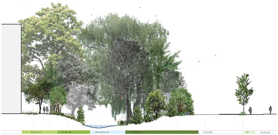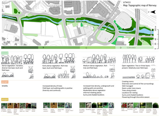 In the more detailed design stage, we wanted to integrate data on vulnerable species and valued nature types in as much detail as possible, by using data from the national biodiversity database “Artsdatabanken”. This was intended to function as a biodiversity knowledge base for the design, and to help us develop principles for design with emphasis on vegetation structure and selection of species, typical tasks within the framework of landscape architecture and land-use planning. However, this turned out to be a difficult process. In total, 555 species have been recorded in Asker municipality. The Norwegian Red List classifies species as belonging to one of four categories: critically threatened (CR), highly threatened (EN), near threatened (NT), or vulnerable (VU) [53]. In Asker, 4.646 single observations belonged to one of these categories. However, more than a thousand of observations were recorded before 1970. It was also unclear to what extent the quality of the data was ensured and by whom, and the spatial accuracy was variable. Moreover, only to a small extent had the material been systematized and adapted to use for planning purposes. Still, there were several vulnerable species in the area, primarily in and along the river corridor (mussels, birds, and insect species). In addition, we identified nature types subjected to protective guidelines according to the Nature Diversity Act [54]. These included hollow oaks (Quercus rubra) and rich deciduous woodland. Overall, though, the biodiversity data were overwhelming in volume and detail, and we found it very difficult to know how to make the best use of it.