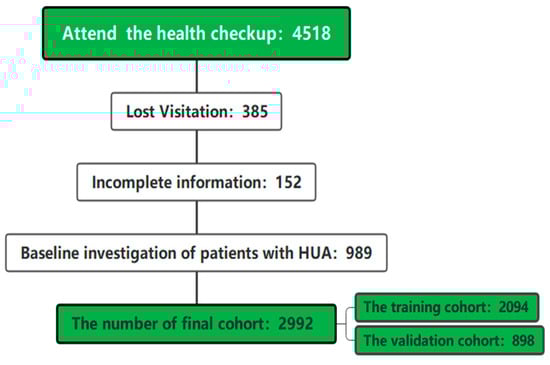 A total of 4518 steelworkers participated in the occupational health screening, removing 989 HUA patients, 385 missed visits, and 152 incomplete information from the baseline survey, resulting in a final cohort size of 2992. The study population was randomly divided into a training cohort (2094) and a validation cohort (898) in a ratio of 7:3, as shown in Figure 1.