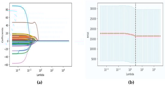 Variable selection based on LASSO regression. (a) LASSO coefficient path map; (b) Cross validation curve.