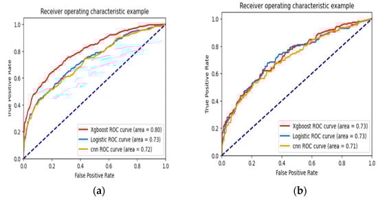 The results of the training set of 2094 cases (70%) showed that the XG Boost model was better than the other two models in terms of sensitivity, specificity, Youden index, F1 score, AUC (95% CI), Brier score, and Log loss, respectively. The CNN model had a higher classification accuracy of 86.8%. The Logistic regression model indicators were slightly worse, as shown in Table 3, ROC curves as shown in Figure 3a.