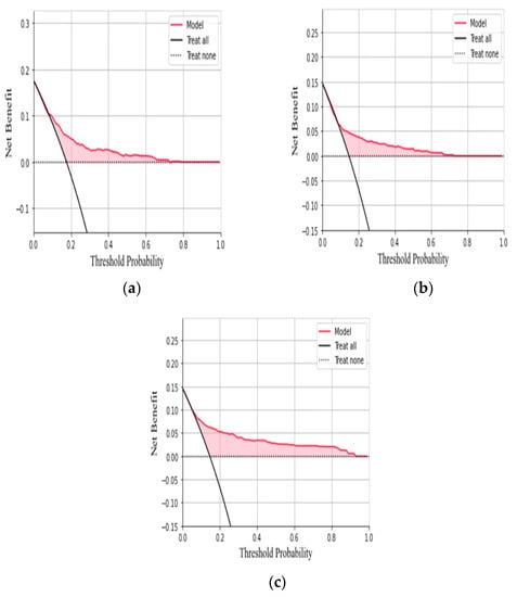 DCA curves of three models: (a) Logistic; (b) CNN; (c) XG Boost.