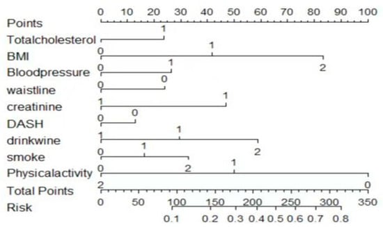Predictor variables were screened by LASSO regression, and 6 predictor variables were finally screened out of 54 variables, including total cholesterol, BMI, blood pressure, waist circumference, creatinine, and DASH score, as shown in Figure 2. The figure on the left was the LASSO coefficient path diagram, where each curve represents the trajectory of the coefficient of each variable, and the variables first attributed to point 0 were excluded. The figure on the right is the cross-validation curve. The mistakes were the smallest when the parameters corresponding to the dashed line were selected, and the intersection of the dashed line and the abscissa coordinates corresponded to the Lambda in the left figure. Finally, six indicators with a large impact on the study outcome were screened. Throughout the literature review, we found that smoking, alcohol consumption, and physical activity were also important influencing factors of HUA [], so they were added together to the subsequent model development.