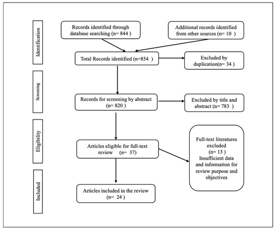Through the literature search of the sources, relevant literature and materials that answered the research question were selected. Data and information were organized using EndNote. All articles eligible for inclusion are from 2014 to 2022. In accordance with the standardized criteria, a total of 854 articles were identified and 34 duplicate articles were removed. After screening 820 by abstracts and titles, 796 articles that are not related to the criteria were excluded and 24 articles were included for the review. The relevant outcomes as reported by the included publications that were relevant to the study were extracted and grouped thematically to suit the objective of the review. The themes were descriptively synthesised based on prior discussion and agreement by the reviewers. The following PRISMA flowchart (Supplementary Materials), Figure 1 describes the screening process of literature for the review.