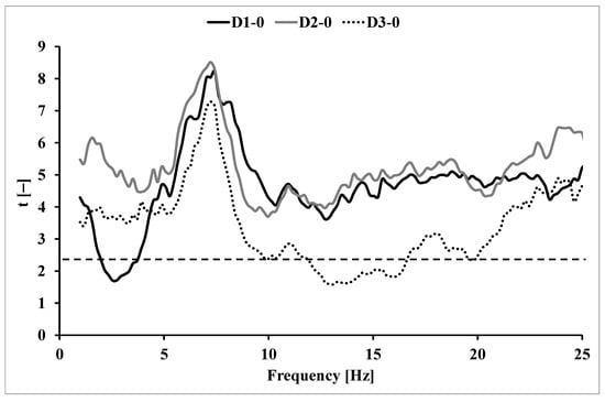Figure 2). The critical value on the graph is marked with a dashed line. The course of the function t(f) for the tremor signal after the exercise test in relation to the resting measurement is shown in