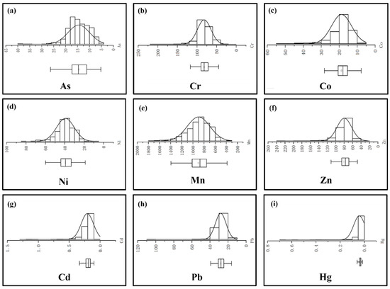 Histograms of heavy metal concentrations in topsoil for (a) As, (b) Cr, (c) Co, (d) Ni, (e) Mn, (f) Zn, (g) Cd, (h) Pb and (i) Hg.
