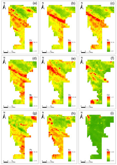 Spatial distributions in topsoil for (a) Cr, (b) Co, (c) Ni, (d) Mn, (e) Zn, (f) Cd, (g) Pb, (h) As and (i) Hg.