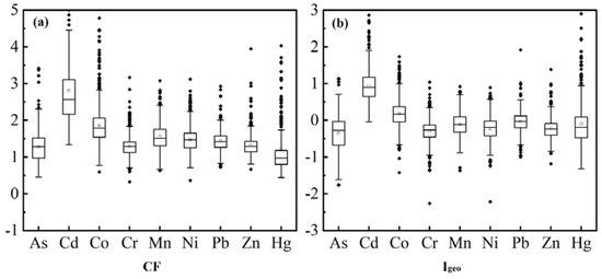 Boxplot of (a) contamination factor (CF) and (b) geo-accumulation index (Igeo) of each metal in the study area.
