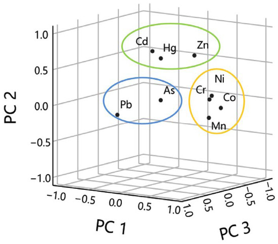 PCA is a well-established and demonstrated statistical strategy routinely utilized to distinguish potential sources of heavy metals in topsoil [49,50]. In this study, heavy metal concentration information was analyzed by PCA, yielding three components based on varimax that in total contributed 69.6% of the change in topsoil contamination (Table 4 and Figure 5).