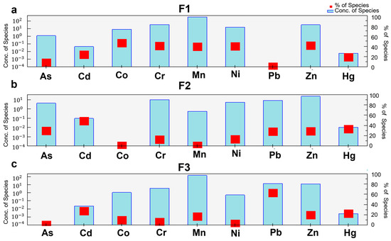 Source contribution of nine heavy metals for (a) F1, (b) F2 and (c) F3 based on PMF model.