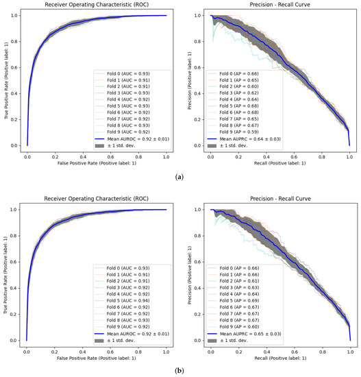 After completing the model optimization stage, we proceed to the model validation. Table 5 shows the different metrics obtained with each hyperparameter combination, compared with the results obtained using the default model configuration. In addition, Figure 4 shows the ROC and Precision–Recall curves, both corresponding to each cross validation step and the average, using the different optimization criteria (AUROC and AUPRC). The values obtained improve the results obtained in the consulted state of the art [7,8,9,10,11,12,25]. Table 6 shows a comparison with related works in terms of AUROC, which is the common metric in most papers that address this problem in the literature. The positive label (1) indicates that admission occurred, while the negative label (0) indicates the patient did not readmit to the ICU. It must be taken into consideration that the values obtained on the referred works have used a different experimental setup than the one proposed in this paper. However, it allows us to define a common base line, as most works use the same database (MIMIC) or the same model (XGBoost).