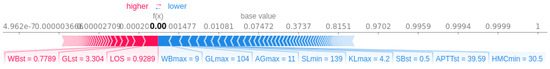 A useful tool for healthcare personnel is understand the prediction obtained for a specific patient. Figure 5 shows the local explainability of a specific patient, predicted as non-readmission (base value = 0). The features with a higher impact on prediction are closer to the dividing boundary between positive and negative values, and the feature impact is represented by the bar size. Moreover, each feature value is shown next to a feature name. The features in red influence the model to predict a readmission, while the features in blue force the model to predict non-readmission. For example, in this case, the feature length of stay (LOS), with a value of 0.93 days for this patient, impacts the model to predict that patient will be readmitted. On the other hand, the maximum level of white blood cells (WBmax), with a value of 9 × 103 leukocytes, impacts the model to predict that the patient will not be readmitted.