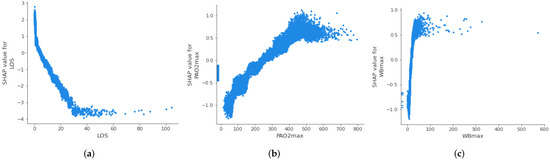 Figure 6 shows the relation between feature values and their associated Shapley value. Although only the three most important features are displayed, this analysis could be done for all features. This information is useful to know the thresholds from which the value of a variable begins to be critical for patient health, allowing the definition of alarms and to extract useful clinical information. For example, in the case of PaO2, it can be observed that values greater than 200 are related to a greater risk of readmission (SHAP value > 0), while values less than 200 indicate a lower risk of readmission (SHAP value < 0).