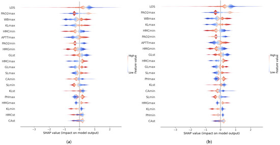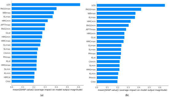 Figure 7 shows the feature importance ranking, both using AUROC (Figure 7a) and AUPRC (Figure 7b) as optimization criterion. The Figure x-axis is related to the feature average impact on the model based on the mean Shapley value. The 20 most important features are presented in this paper, the ranking being almost the same in both cases (the top-5 features are exactly the same). The length of ICU stay is the most important feature of the model. However, the ranking of the features does not have to be the same in all patients.