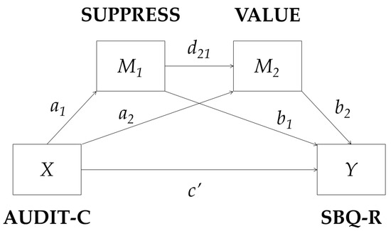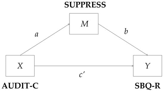 Descriptive statistics and box plots of all study variables are provided in the Supplementary Materials (see Table S1 and Figure S1). No deviations from normality in terms of variable skewness and kurtosis were observed, apart from the variables of suicide risk (SBQ-R) and alcohol use as a means to suppress difficult thoughts and feelings (SUPPRESS). The data on these variables were slightly skewed (1.88 for SBQ-R and 1.72 for SUPPRESS) and the kurtosis was slightly higher (3.86 for SBQ-R and 2.66 for SUPPRESS) than would be expected in a normally distributed measure. There were some outliers in the data on SBQ-R and SUPPRESS; however, it was decided not to remove them, because they are legitimate observations that are a natural part of the population due to the rarity of high suicide risk and high deliberate alcohol use to relieve psychological stressors. Given that these measures were used in a general population sample, some deviation from the normal distribution could be expected; therefore, because the deviation was small and the sample size was large, no impact on the accuracy of the statistical test was expected and no transformation was used.