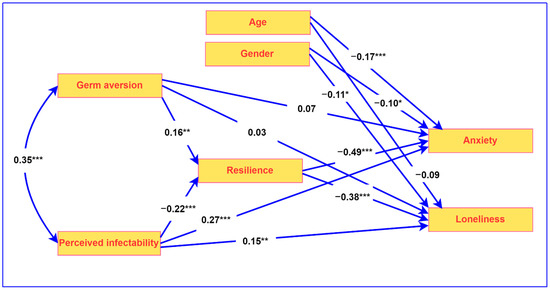 The path analysis model that was used to examine the mediating role of resilience is presented in Figure 1, along with the associated standardized regression coefficients. In this model, perceived infectability and germ aversion are the predictors that are antecedents to resilience, while loneliness and anxiety are the dependent variables. Gender and age were significantly related to the predictor variables. In particular, women reported higher levels of anxiety (M = 46.03, SD = 10.46, t = 3.76, p < 0.001) and loneliness (M = 48.30, SD = 11.60, t = 3.49, p < 0.001) than men (anxiety: M = 41.24, SD = 8.89; loneliness: M = 43.40, SD = 9.95). Younger participants reported higher levels of anxiety (r = −0.19, p < 0.001) and loneliness (r = −0.12, p = 0.030) than older participants. Gender and age were therefore added to the path analysis model as covariates.