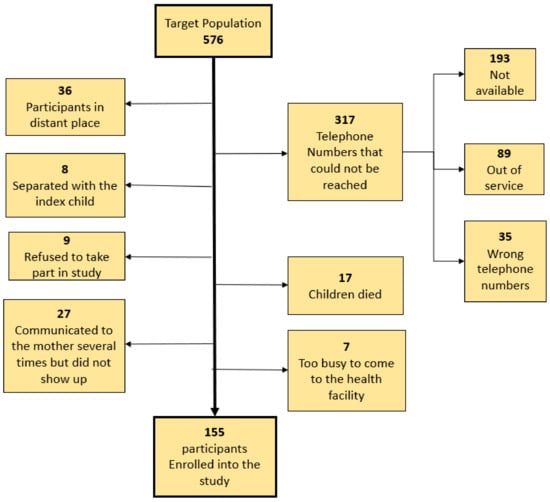 In the clincial trial, we enrolled 576 children. Out of these, we were able to enroll 155 into the current study. We failed to reach 317 participants on the phone because the telephone contacts were not reachable. The rest of the reasons for not enrolling other eligible children into this study are shown in the study profile, (Figure 1).