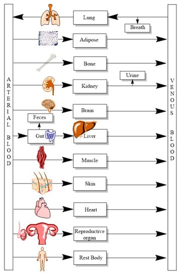 - Haddad, S.; Nong, A. Physiologically based pharmacokinetic model: Excretion via urine, feces, and breath. In Physiologically Based Pharmacokinetic (PBPK) Modeling; Elsevier: Amsterdam, The Netherlands, 2020; pp. 175–209. [Google Scholar] [CrossRef]