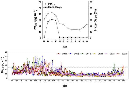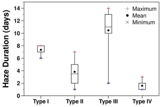 | Duration (Days) | No. of Haze Episodes | No. of Episodes by Haze Type (I-II-III-IV) | Coefficient of Variation of Daily PM2.5 (Standard Deviation/Mean) |
