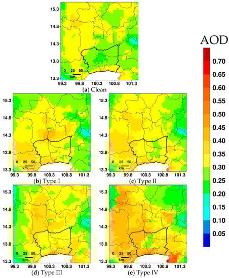 - Type I: Four haze episodes are categorized in this haze type. This is the second most persistent haze type, and the average duration of haze episodes is 7.3 days. It has two haze episodes of eight days and a haze episode each of six and seven days, respectively (Table 2). In terms of particulate pollution, this is the second most polluted haze type with an average PM2.5 of 58.5 μg m−3. As this haze type is triggered by the cold surge over Greater Bangkok, which brings cold and dry air, it has the lowest average temperature and average relative humidity (26.9 °C and 49.1%, respectively). A cold surge generally induces less cloud cover, which leads to an increase in global radiation as shown by the lowest average cloud cover of 4.9 and the second-highest average global radiation of 456.6 W m−2. Due to more stagnant weather conditions, wind recirculation is relatively low with an average recirculation factor of 0.12. The spatial variation of AOD suggests relatively higher AOD (ranges between 0.2 and 0.6) in Greater Bangkok and connected provinces on the northern and western sides as compared to those on the eastern side and far north. In comparison, AOD over clean days is relatively low over Greater Bangkok.