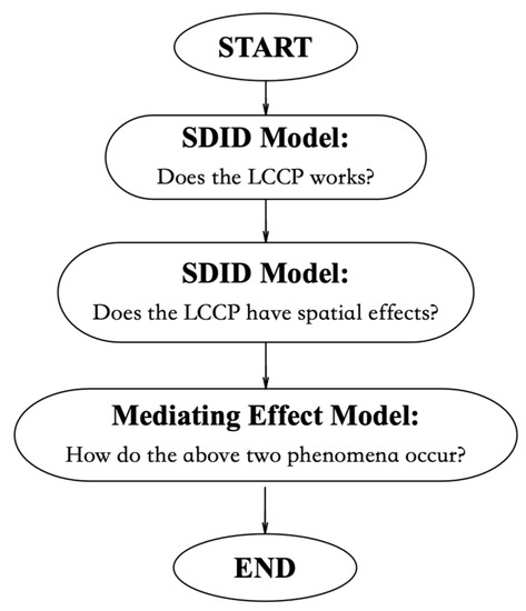 To clarify our empirical model more directly, we present the modeling steps in Figure 1 to analyze the three questions we bring out in the introduction section: (i) Has the LCCP program successfully improved GTFEE in pilot cities? (ii) Does the LCCP 76 program have any spatial spillover effects that may affect GTFEE within neighboring regions? (iii) How do those two phenomena occur?