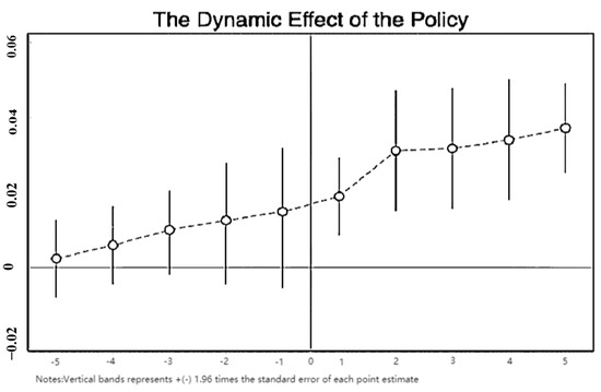 where is the dummy variable indicating the implementation of LCCP policy, and other variables are the same as those mentioned above. We use 5 as the threshold for setting the dummy variable. Assuming that is the start year for the LCCP program, indicates , . Since represents the policy effects on GTFEE, can test the parallel trend [45]. In other words, only if the direct effect of is not statistically significant, will the parallel trend test be passed.