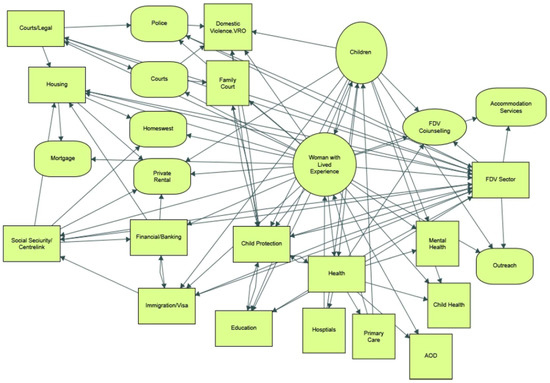 The professionals produced by the university (social workers, lawyers, policy writers, teachers, etc.) usually work within organisations offering one or two discrete services. Women and children experiencing FDV and seeking assistance with their complex situation may find themself accessing a wide variety of organisations and professional services which are not well integrated, may use different jargon, and may assume different causes of the problem and prioritise different outcomes for the person. Consequently, the web of professional services accessed by women and children experiencing FDV demonstrates the complexity, as was mapped by a member of the CoP.