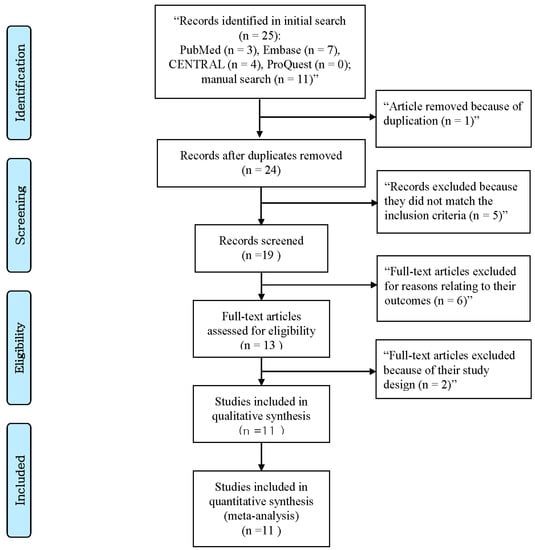 In this study, a comprehensive literature search was conducted to identify relevant studies on the use of Virtual Reality (VR) technology. The databases searched include CENTRAL, PubMed, Embase, and ProQuest. In addition to electronic searches, manual searches were also performed to ensure a comprehensive search process. To refine the search results in PubMed and CENTRAL, the Medical Subject Headings and Text Word indexes were utilized, while the Emtree index was used in the Embase search. The inclusion criteria were applied to the initial pool of studies identified, resulting in the final selection of 11 studies [11,12,13,14,15,16,17,18,19,20,21]. The details of the studies that were excluded from the analysis are documented in Figure 1.