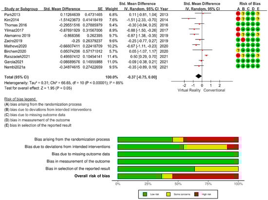 For our analysis, we compared the VR-based intervention with a conventional one. Six studies [11,12,13,14,15,16] compared the control groups to VR-based-intervention groups. Alemanno (2019) [17] reported a quasi-experimental design with one arm comparing effects pre- and post-intervention. Garcia and Nambi compared VR-based interventions to control groups who received sham-VR treatments; other research conducted an RCT with three post-intervention arms [18,19].
