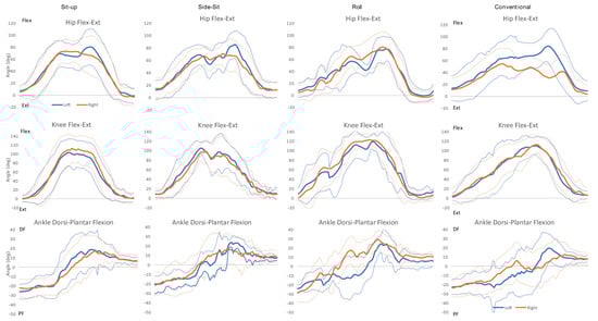 Depending on the method, the mean maximum (peak) amount of hip flexion used to achieve the task ranged from 89.1° to 97.3°, and knee flexion ranged from 118.3° to 129.1°, with both ankle dorsi and plantar-flexion ranging between 27–33° (Table 3). Representative kinematic graphs of each method are presented in Figure 1.
