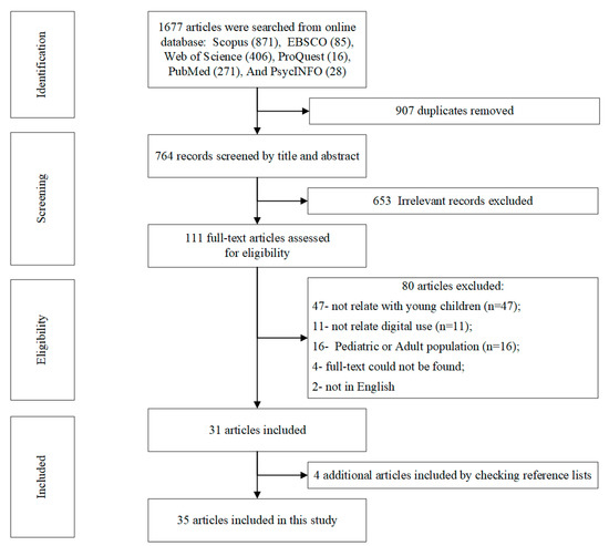 Figure 1 displays a flowchart of the study selection process. As shown in Figure 1, a total of 1677 articles were found by searching the electronic databases. Among these articles, 871 were from Scopus, 85 from EBSCO, 406 from Web of Science, 16 from ProQuest, 271 from PubMed, and 28 from PsycINFO. These articles were filtered in the following steps. First, we removed the duplicate articles (n = 913) using Endnote. Second, 764 articles were imported into Covidence and screened by title and abstract, and 653 studies were excluded because of irrelevance, leaving 111 articles for further scrutiny. Third, the 111 articles were assessed for full-text eligibility, and 80 were excluded because they (1) were unrelated to young children (n = 47); (2) were unrelated to digital usage (n = 11); (3) used a pediatric or adult population only (n = 16); (4) had no full-text (n = 4); or (5) were not in English (n = 2). Finally, after checking the references of the 31 included articles, we found four additional articles and included them in this study. Eventually, 35 articles were chosen and analyzed in this study.