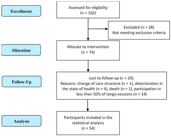 As shown in Figure 1, out of 102 people screened for eligibility, 74 were recruited from 8 different nursing homes for a 12-week tango intervention, according to predefined inclusion criteria. Fifty-four participants completed the intervention program and were therefore eligible for statistical analyses. Reasons for dropout were change of care structure (n = 1), a deterioration in their state of health (n = 4), death (n = 1) and absence in more than 50% of the sessions (n = 14). No significant differences in baseline characteristics were found between dropouts and those participants who completed the intervention. The mean age was 84.9 ± 6.7 years old, and the average MMSE score among 54 participants was 14.5 ± 7.4, with 52% showing moderate CI and 24% showing severe CI. Table 3 shows the main characteristics of the total sample by category according to the MMSE score.