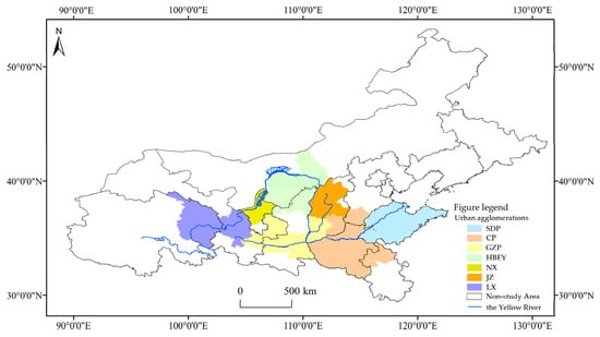 The YRB is located in the new urbanization strategic pattern “Three Vertical and Two Horizontal” in China, and occupies a very important strategic position in China’s economic and social development and ecological security barrier construction. Urban agglomerations in the YRB are mainly composed of seven urban agglomerations [30]: Shandong Peninsula Urban Agglomeration (SDP), Central Plain Urban Agglomeration (CP), Guanzhong Plain Urban Agglomeration (GZP), Hohhot–Baotou–Erdos–Yulin Urban Agglomeration (HBEY), Urban Agglomeration along the Yellow River in Ningxia (NX), Jinzhong Urban Agglomeration (JZ), and Lanzhou–Xining Urban Agglomeration (LX).