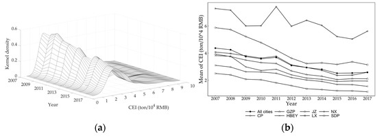 Temporal evolution characteristics of the CEI of urban agglomerations in the Yellow River basin from 2007 to 2017. (a) Kernel density curve. (b) Changes in average CEI.