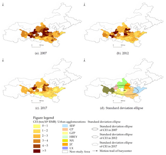 Combined with the changes in the distribution position, the distribution form of the main peak, the degree of tailing, and the number of wave crests of the kernel density curve during the study period, it can be found that there is a significant left shift trend of the distribution position of the nuclear density curve, indicating that there is a downward trend in the CEI of the urban agglomerations in the YRB (Figure 2a). The height of the main peak decreases, and the width becomes larger, indicating that the differences in CEI within urban agglomerations continue to rise. The significant right-tailing and double-peak phenomenon in the period indicate that the CEIs of some cities in the urban agglomerations are significantly higher than that of other cities. Secondly, from the changes in the average CEI of each urban agglomeration, the average CEI of NX is the highest, followed by JZ, and both of them exceed the overall average level. The average CEI of LX is basically equal to the average level, while the average levels of SDP and CP are relatively low. It is worth noting that, when the overall CEI is decreasing, the rate of reduction is also slowing down. The average CEI of all cities and the urban agglomerations of NX and LX rebounded at the end of the study period. Finally, from the spatial distribution and standard deviation ellipses of the CEIs of each urban agglomeration (Figure 3), although there is a downward trend in the CEIs of urban agglomerations in the YRB generally, the areas and rotation angles of the standard deviation ellipses have no significant changes, indicating that the spatial distribution mode of CEI of urban agglomerations in the YRB has not changed significantly from 2007 to 2017. The center of gravity of the ellipse moves slightly from the middle to the west, indicating that the rate of decline of urban CEI in the western cities in the YRB is slightly lower than the overall average level.