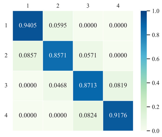 In Equation (1), prh represents the probability that the city with state r at time t will transfer to state h at time t + 1; nrh represents the number of cities from state r at time t to state h at time t + 1; nr,t represents that the city is in state r at time t; k represents the states. In this paper, urban CEI is divided into four states according to quartiles, expressed by k = 1, 2, 3, 4 (low intensity, lower-middle intensity, upper-middle intensity, high intensity). Moreover, a transition of state from high intensity to low intensity is defined as “downward transfer”, and vice versa is defined as “upward transfer”. If there is no obvious transfer trend, it is defined as stable.
